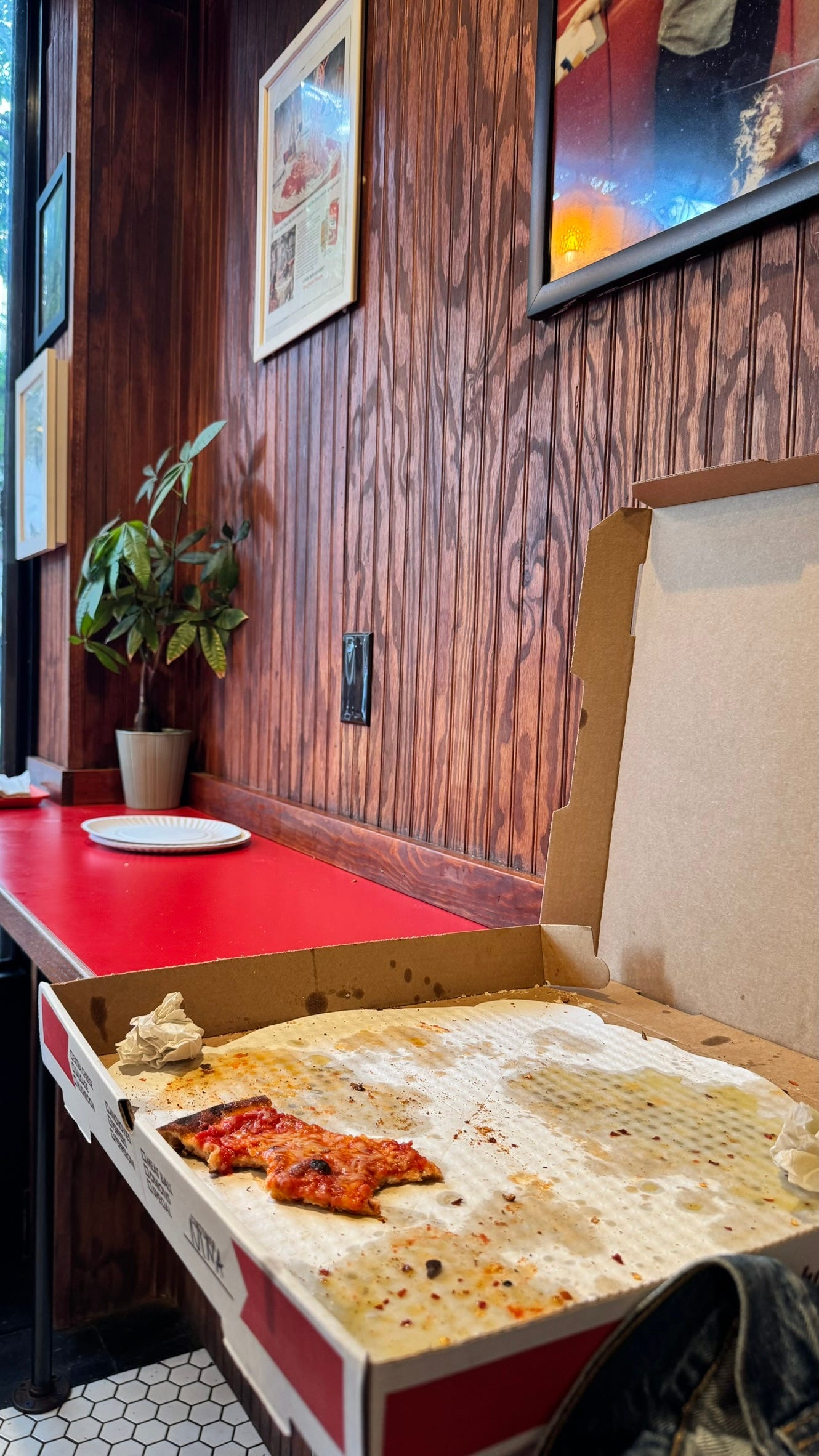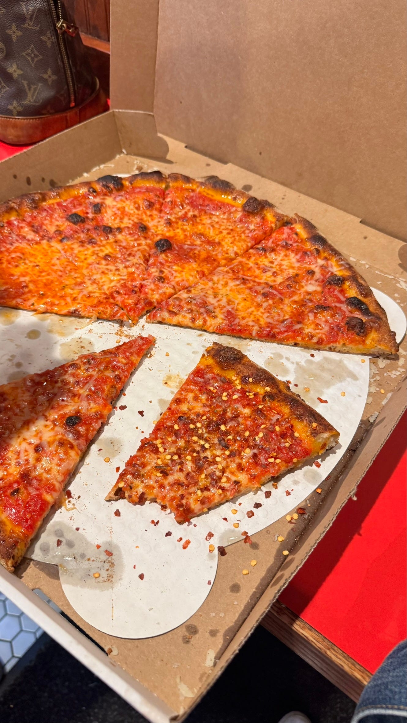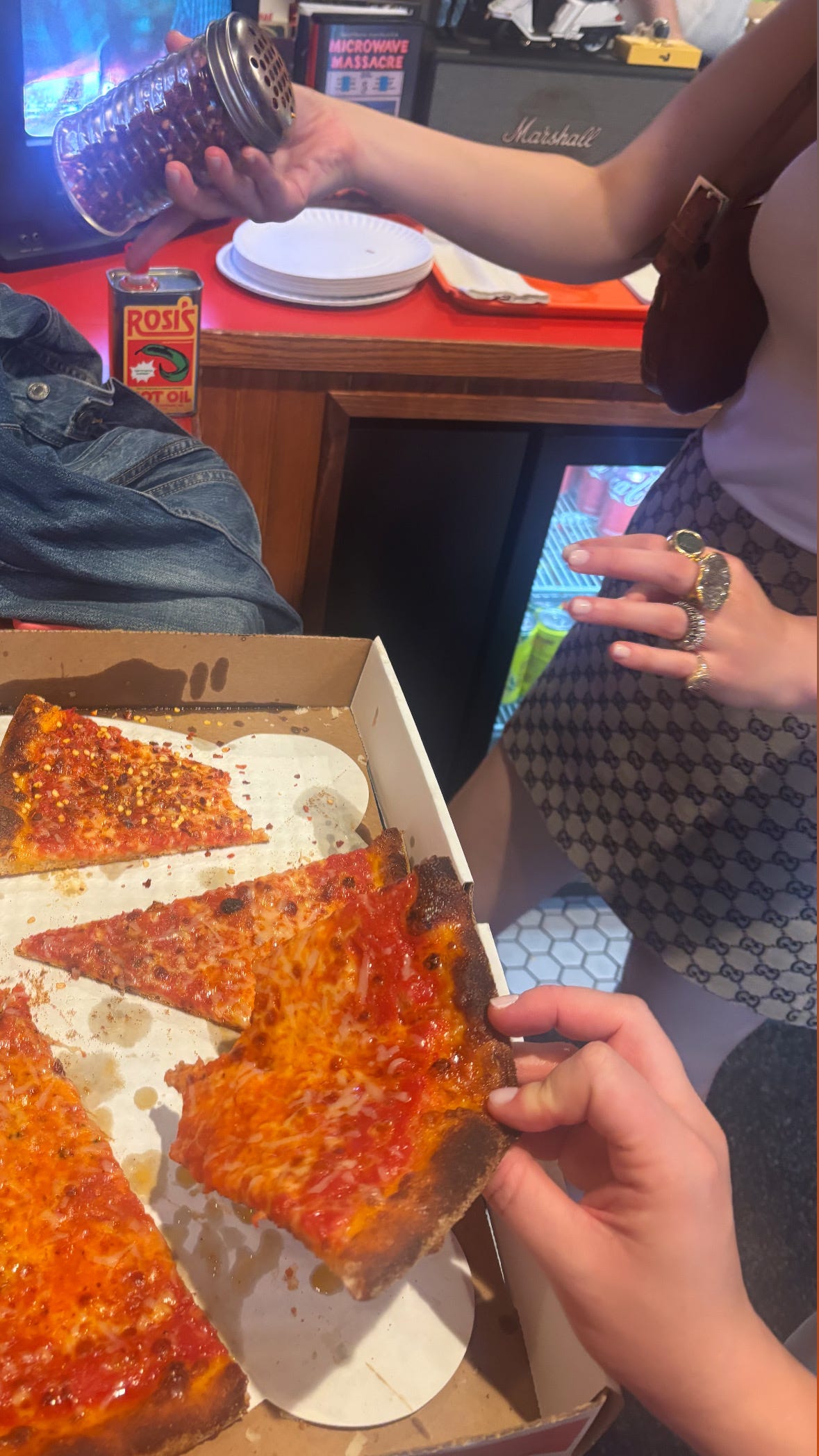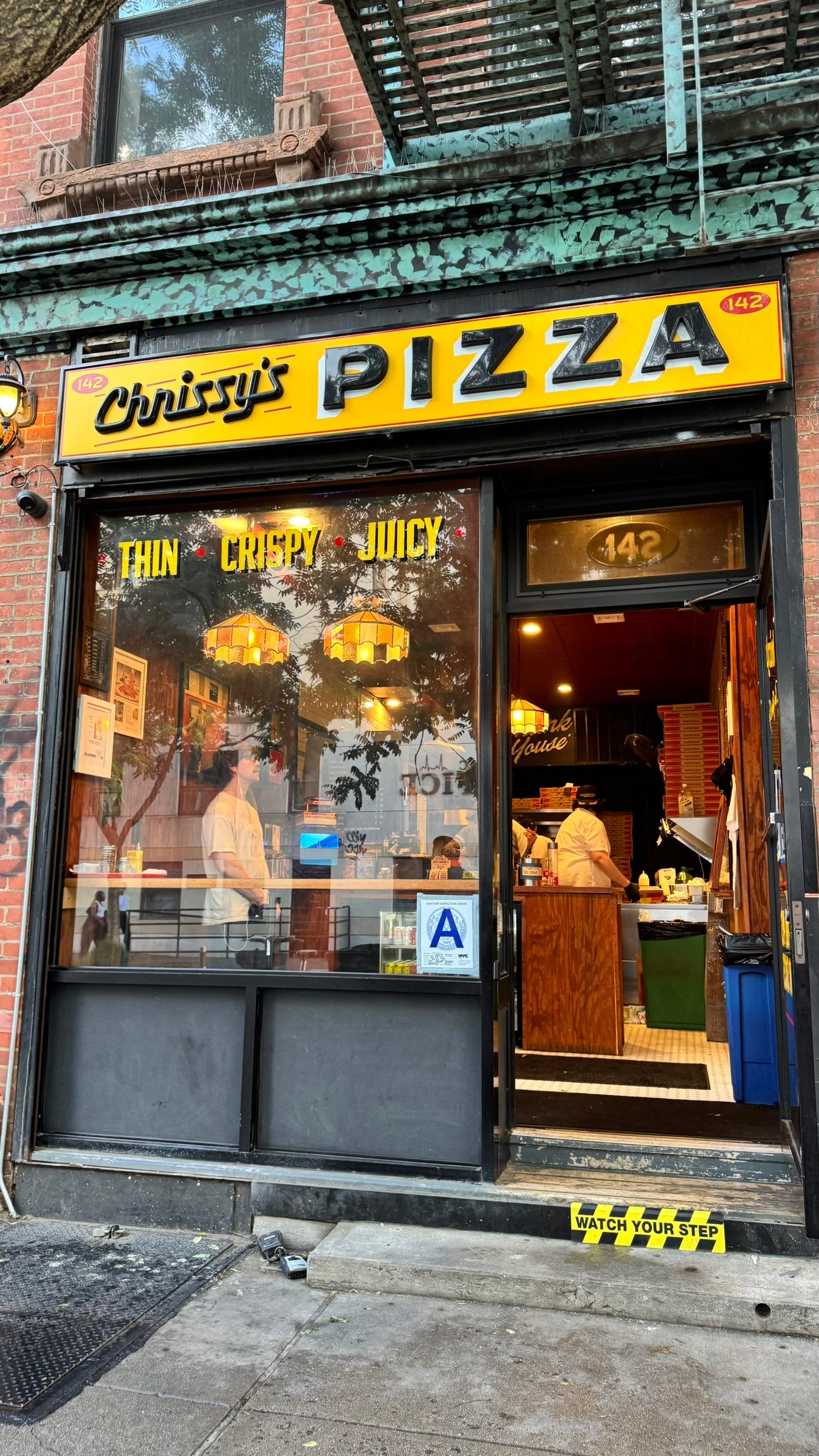 This is how it happened. My friends and I were supposed to meet at a wine bar called Bouquet. When we realized that Bouquet was closed for a private event, we pivoted to another spot. The vibes were weird at our backup bar, and it was only in searching for where to go next that my friend Val remembered Chrissy’s was nearby. So we walked over, and to my surprise, there wasn’t a line. We placed an order, and waited a normal amount of time, and ate the pizza standing at the tiny counter. We dunked our slices into pools of Rosi’s Hot Oil that got all over our fingers. We shared the last slice, one bite at a time. And when we left, we couldn’t tell if we were sweaty from the heat or wet from the rain or just greasy from the pizza, but it didn’t matter that our hair had frizzed and our shoes were soaked, because this was the best impromptu way to spend a Saturday night in New York City.