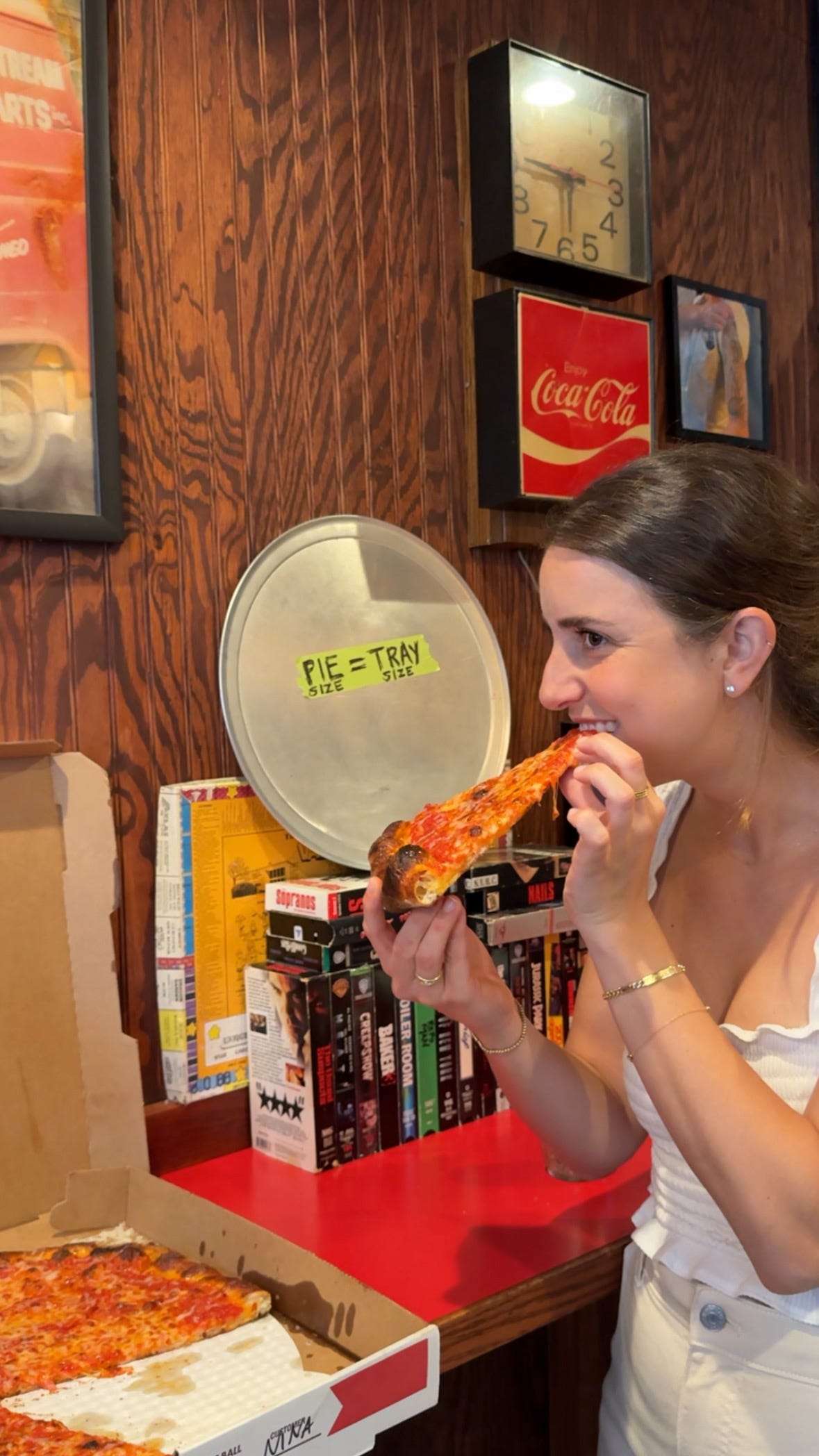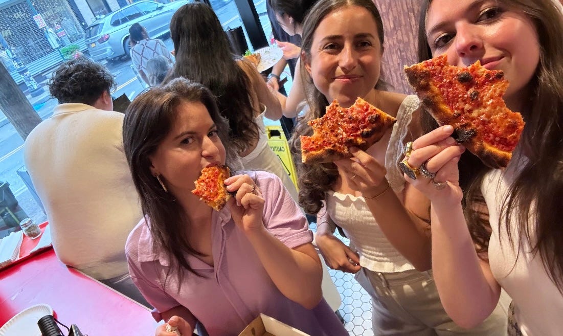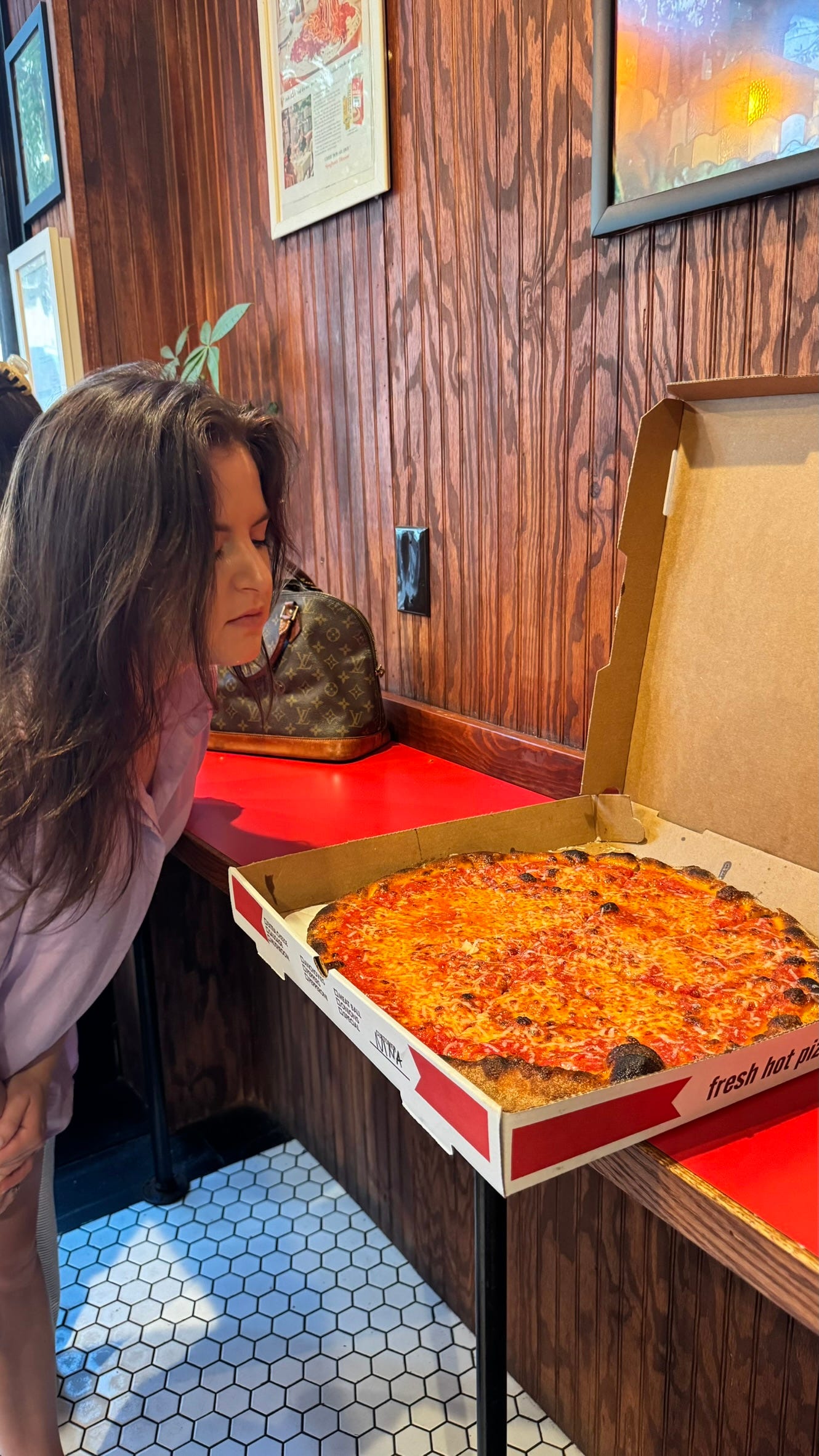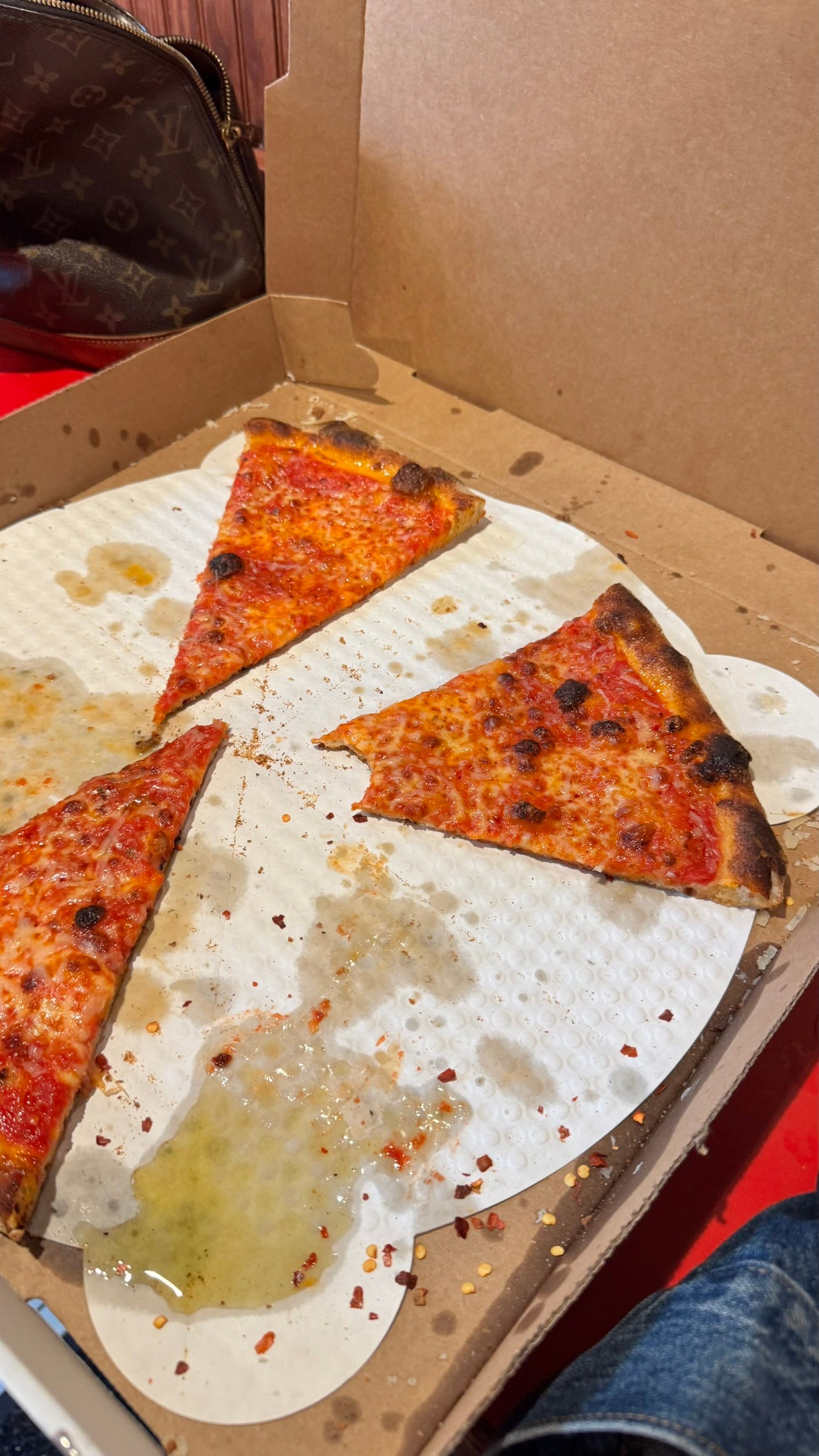 This is how it happened. My friends and I were supposed to meet at a wine bar called Bouquet. When we realized that Bouquet was closed for a private event, we pivoted to another spot. The vibes were weird at our backup bar, and it was only in searching for where to go next that my friend Val remembered Chrissy’s was nearby. So we walked over, and to my surprise, there wasn’t a line. We placed an order, and waited a normal amount of time, and ate the pizza standing at the tiny counter. We dunked our slices into pools of Rosi’s Hot Oil that got all over our fingers. We shared the last slice, one bite at a time. And when we left, we couldn’t tell if we were sweaty from the heat or wet from the rain or just greasy from the pizza, but it didn’t matter that our hair had frizzed and our shoes were soaked, because this was the best impromptu way to spend a Saturday night in New York City.