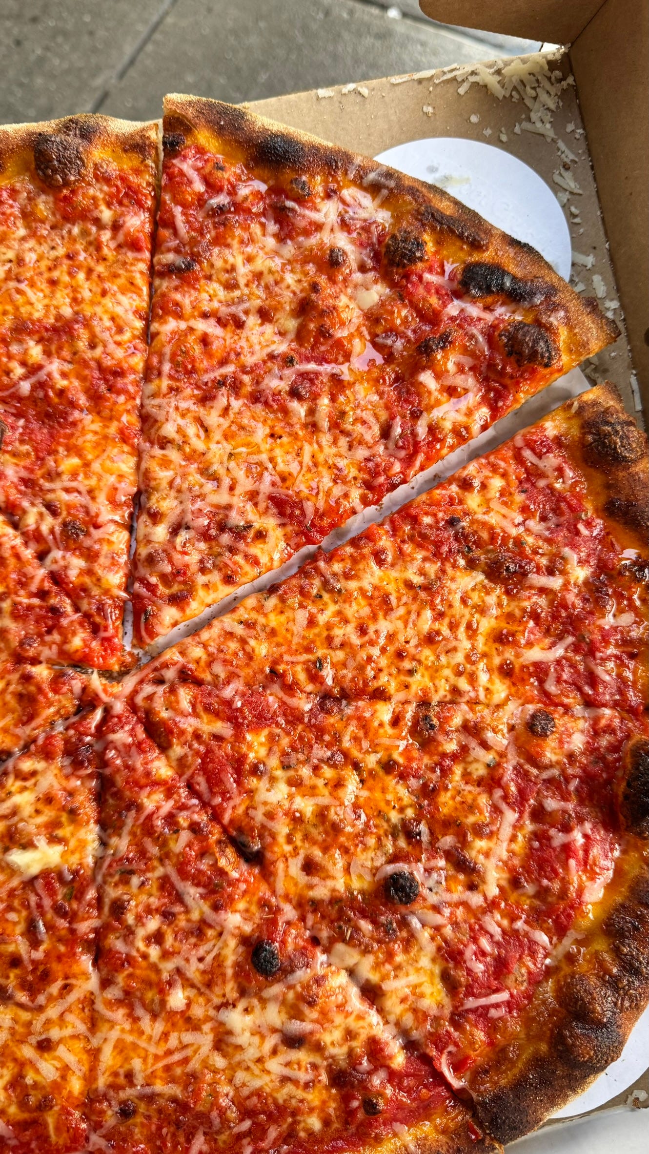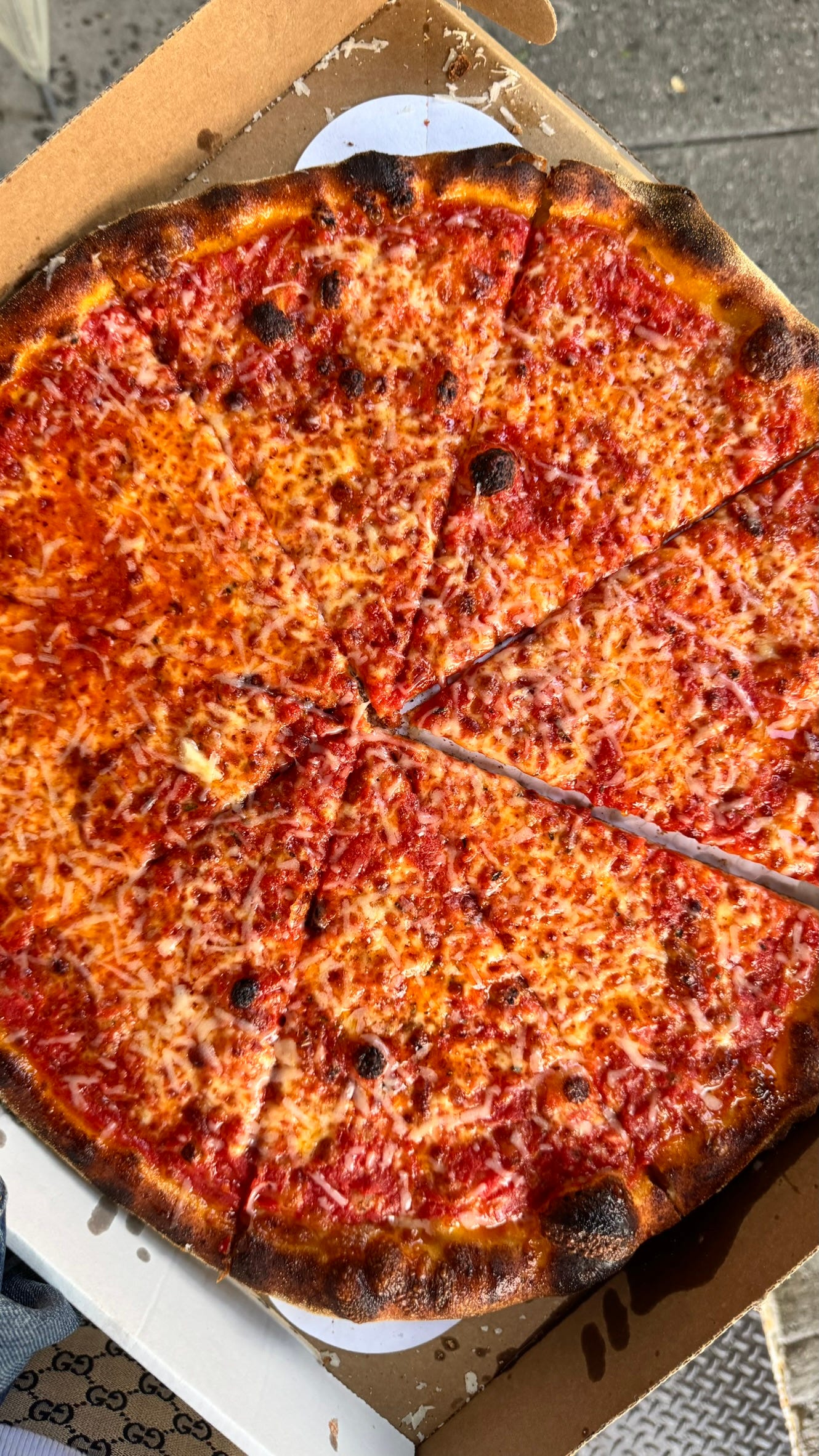 This pizza is worth that 25 minutes. It’s worth the long subway ride from lower Manhattan. It’s even worth getting rained on, as I did on Saturday (twice). In fact, this is some of my favorite pizza I’ve had in New York—and I don’t say that lightly—with crispy, crackly crust and tomato sauce so tart it made me smack my lips. The neon orange mozzarella evokes Chuck E. Cheese nostalgia in the best way, and that dusting of grated parm is pure 🤌.